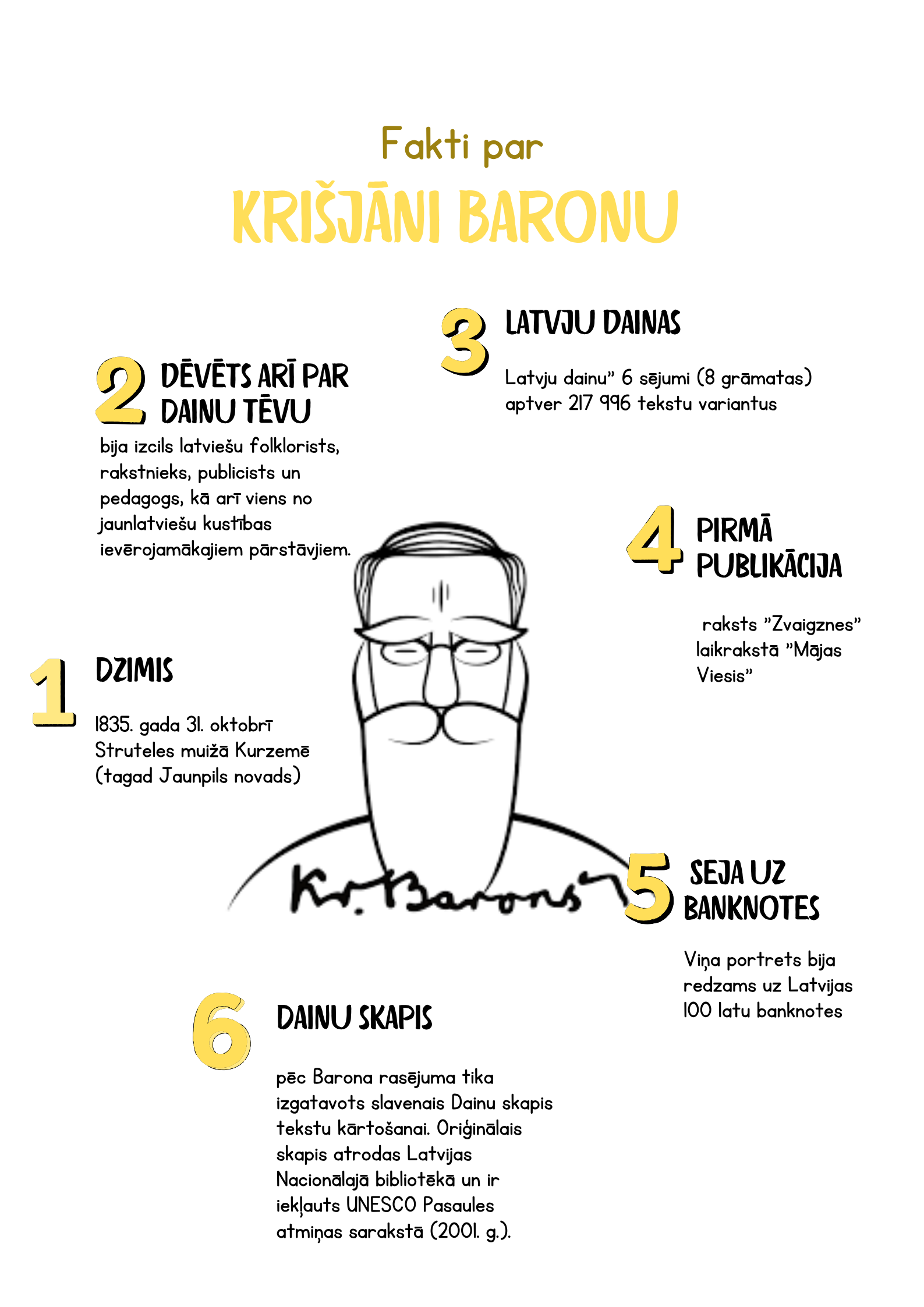 Ja kādreiz esi turējis rokās 100 latu banknoti, noteikti esi pamanījis kungu ar sirmu, garu bārdu. Tas ir Krišjānis Barons, plašāk pazīstams kā “Dainu tēvs”. Šogad aprit 190 gadi kopš viņa dzimšanas.