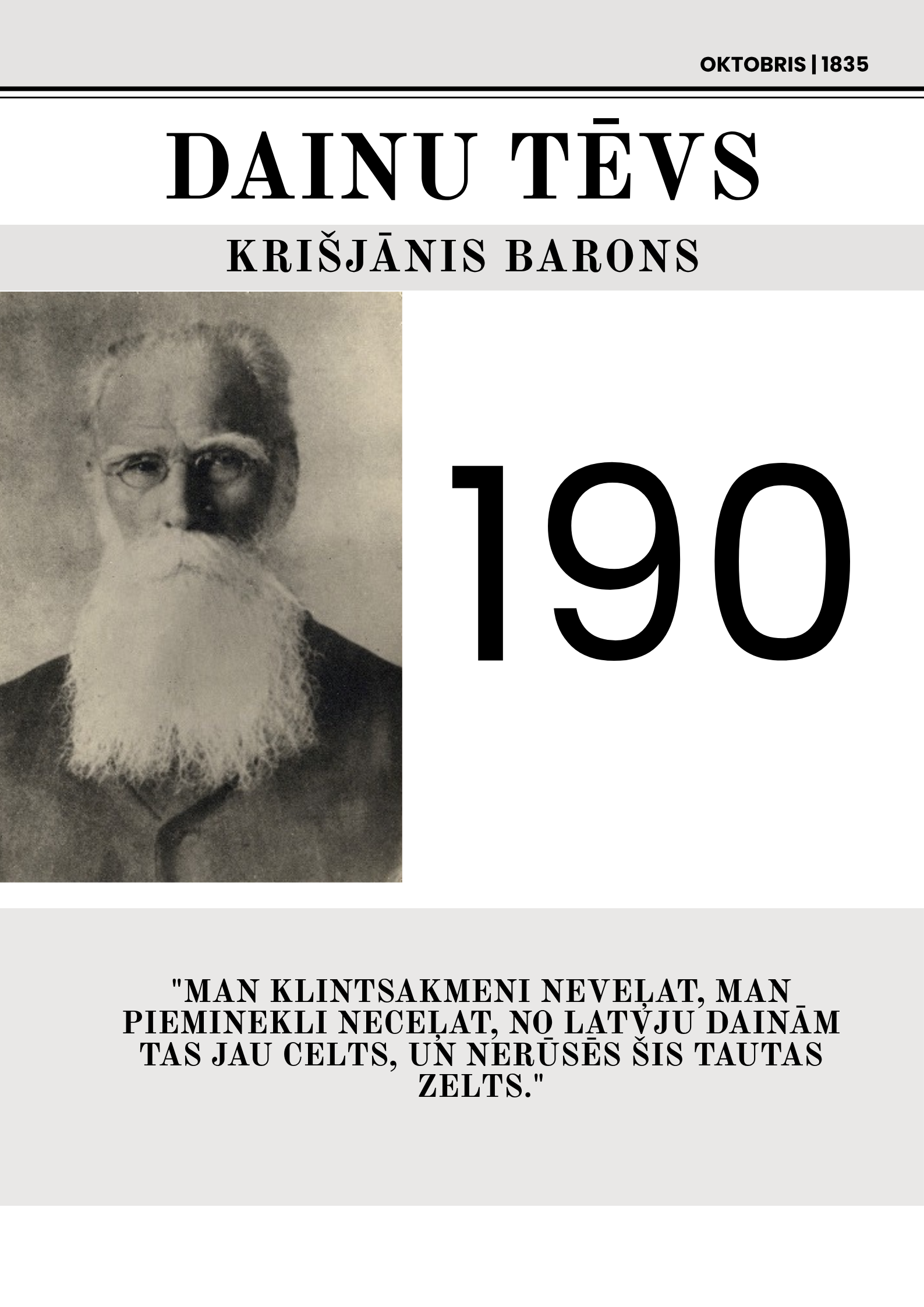 Ja kādreiz esi turējis rokās 100 latu banknoti, noteikti esi pamanījis kungu ar sirmu, garu bārdu. Tas ir Krišjānis Barons, plašāk pazīstams kā “Dainu tēvs”. Šogad aprit 190 gadi kopš viņa dzimšanas.
