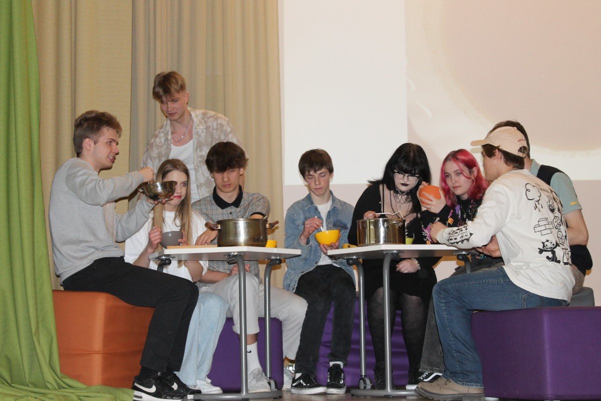 Lai saņemtu skolas simbolu - žetonu, 22.martā 12.a un b klases apvienojās un kopā parādīja darbu, kas tapis pēc Bellas Kaufmanes darba "Augšupa pa lejupejošām kāpnēm" motīviem. Izrādes beigās, ievērojot skolas tradīcijas, viņi kopā ar skolotāju Inesi Puhovu, dziedāja "Lilioma dziesmu", bet uz svinīgo žetonu saņemšanu, zālē ienāca ar polonēzi.
