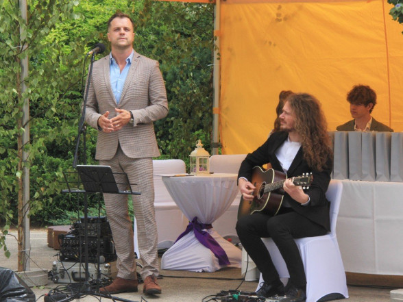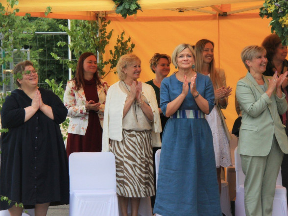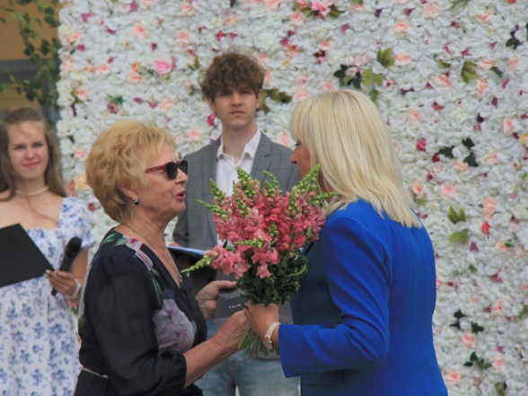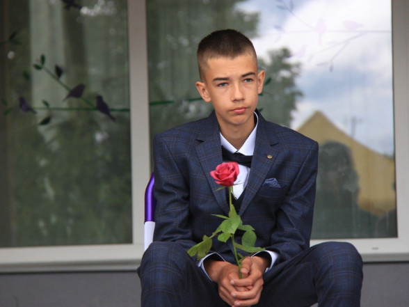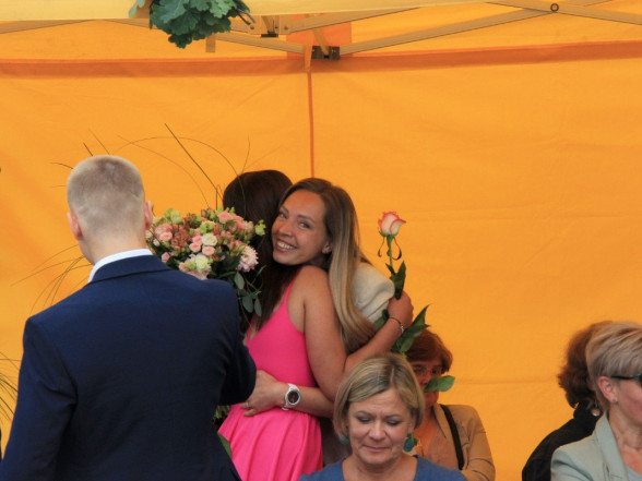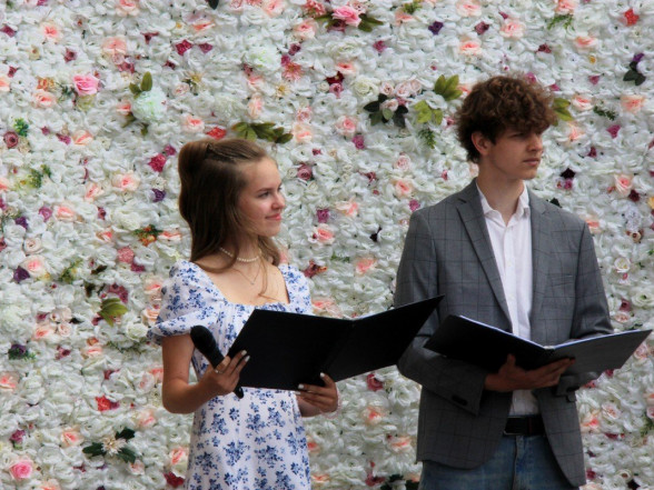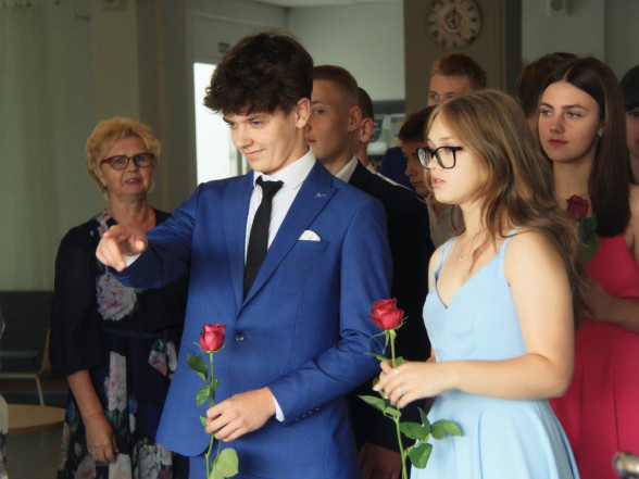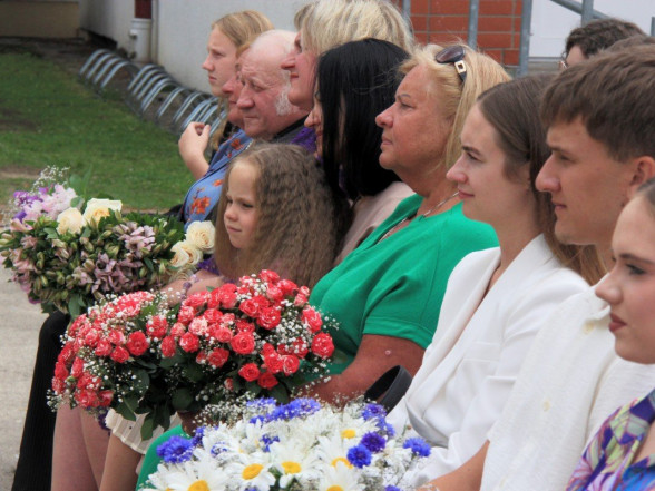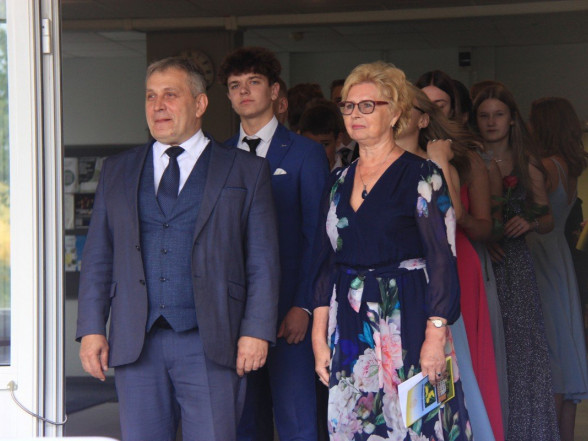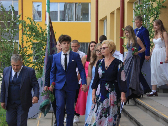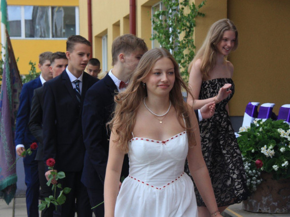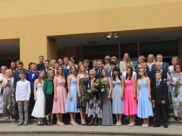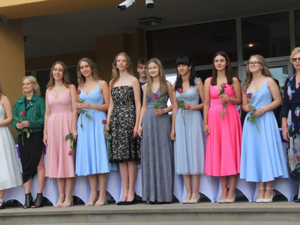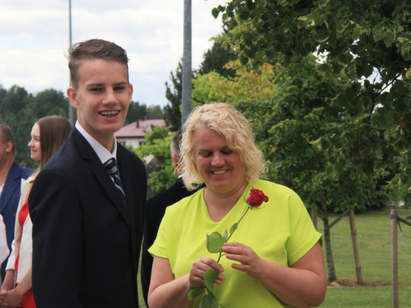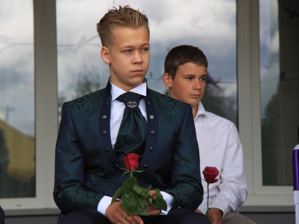 9.c klases izlaidums Ulbrokas vidusskolā. Absolventus, skolotājus un vecākus priecē divi puiši, kuri paši beiguši pamatskolu pirms kāda laika - Gints Andžāns un Mārcis Vasiļevskis.