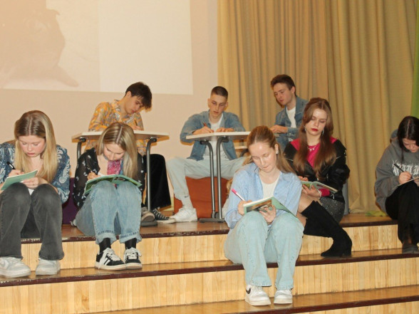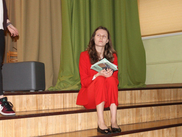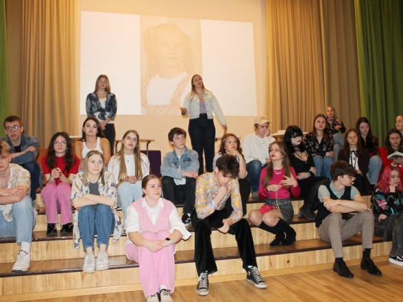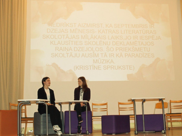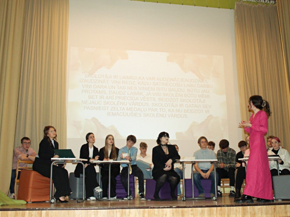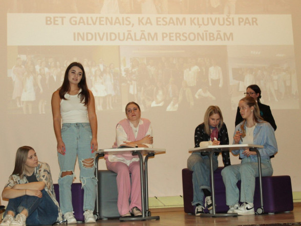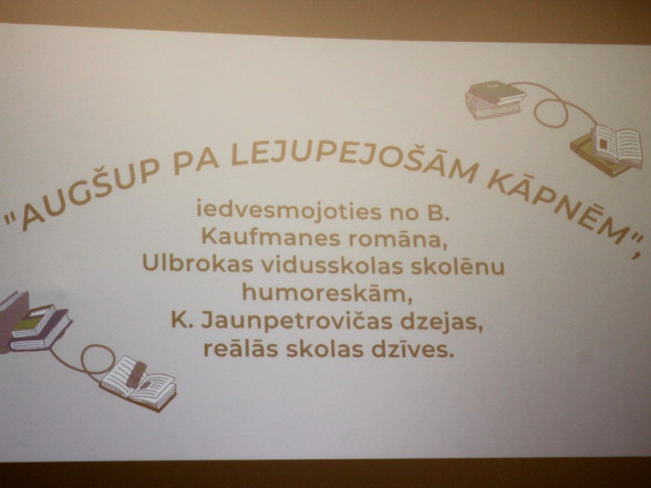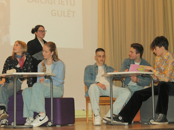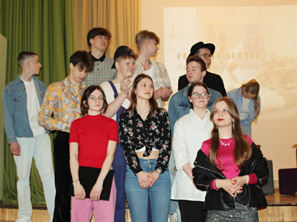 Lai saņemtu skolas simbolu - žetonu, 22.martā 12.a un b klases apvienojās un kopā parādīja darbu, kas tapis pēc Bellas Kaufmanes darba "Augšupa pa lejupejošām kāpnēm" motīviem. Izrādes beigās, ievērojot skolas tradīcijas, viņi kopā ar skolotāju Inesi Puhovu, dziedāja "Lilioma dziesmu", bet uz svinīgo žetonu saņemšanu, zālē ienāca ar polonēzi.